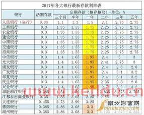 年银行存款利率表如下:2017年四大工行、建行、中行、交行存款利率表如下:整存整取:三个月35%,半年55%,一年75%,二年25%,三年75%,五年75%。零存整取、整存零取、存本取息:一年35%,三年55%,五年55%。央行。